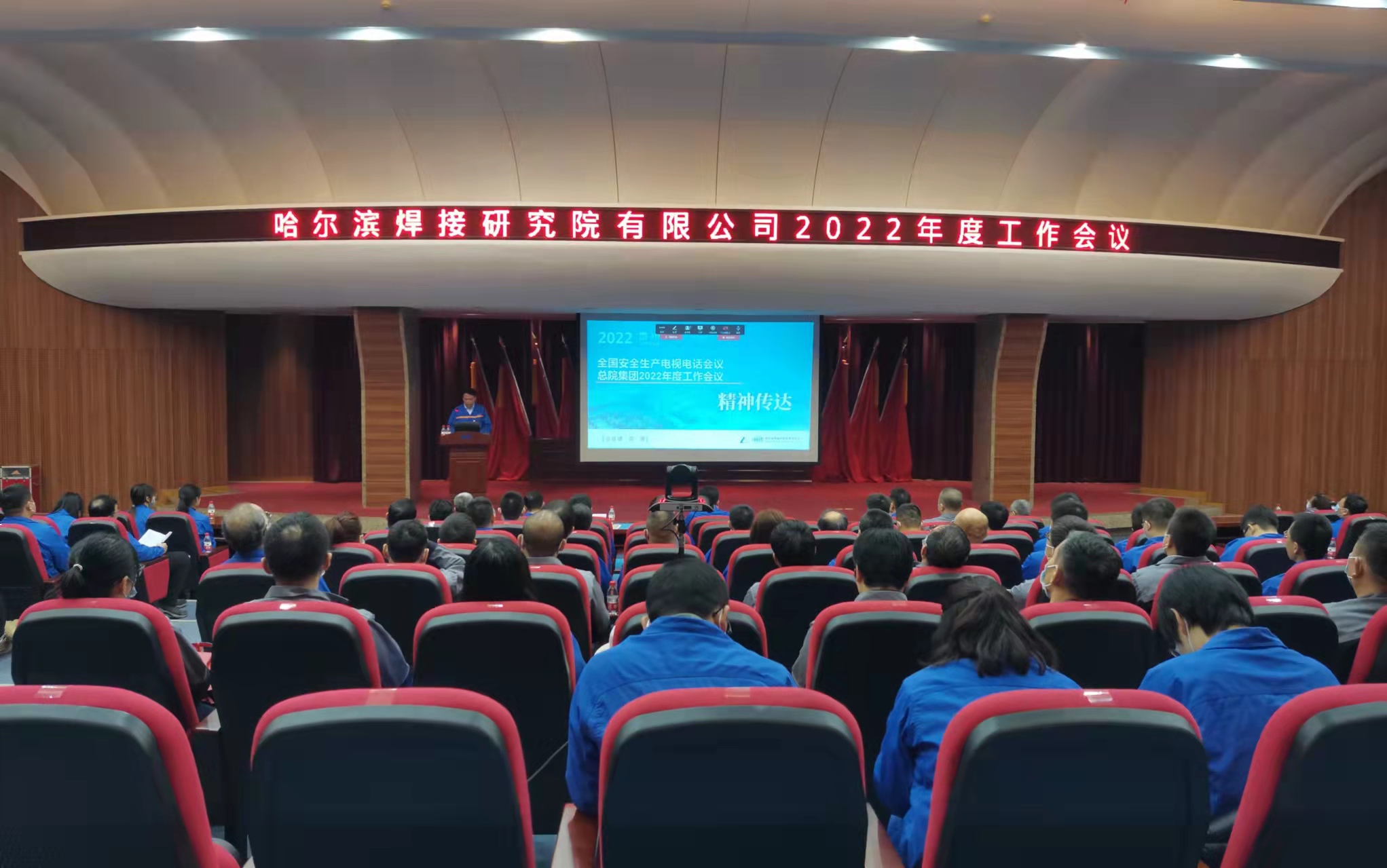 哈焊院中層干部、各黨支部書記及委員、各分工會主席、團委書記及各團支部書記、職能部門全體員工、部分業(yè)務部門科室負責人、部分職工代表共計100余人參加會議。哈焊國創(chuàng)公司、哈焊所華通公司分別在青島、常州視頻分會場參加會議。